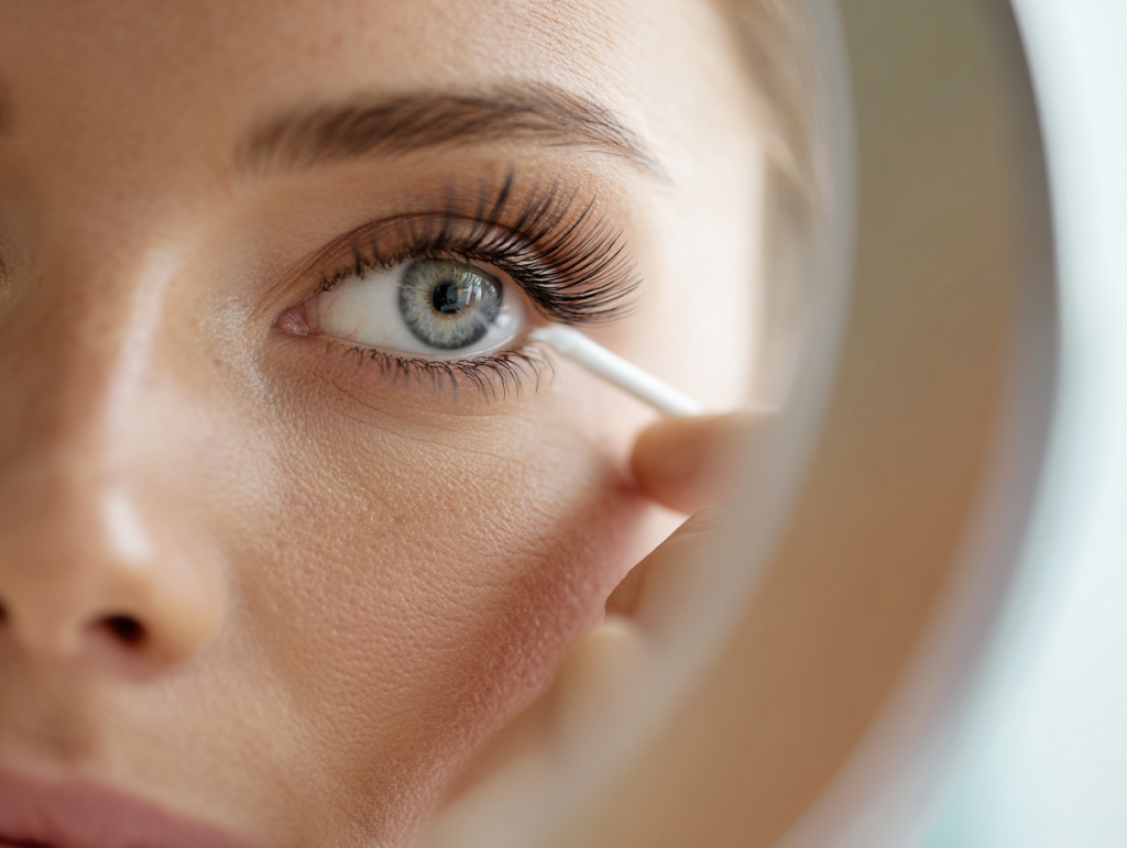 Allow the adhesive to fully dry before touching or applying makeup. Use a handheld fan or air-dry for a few minutes. Proper drying and setting help at-home lash extensions stay intact longer, maintaining curl and volume.